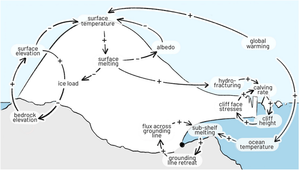 One of the most promising developments in the research and monitoring of tipping elements is the integration of satellite remote sensing into climate models. ESA’s new Cryotipping project of the Climate Change Initiative (CCI) will develop new methods to investigate an instability causing the retreat of the Thwaites glacier in Antarctica (see figure 2). Thwaites glacier covers an area of 192, 000 square kilometres, and holds a volume of ice equivalent to a 65-metre rise in sea level, and is thought to be unstable. The team led by Inès Otosaka from Northumbria University in the UK will use EO data to initialise an ice sheet model and investigate the critical slowdown in the rate of its grounding line retreat at the onset of tipping, as well as the potential irreversibility of Thwaites’ retreat over the coming centuries.