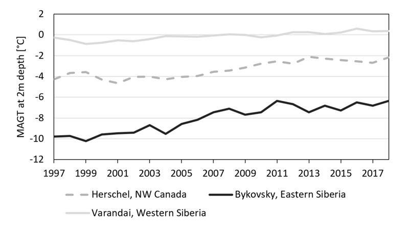 Obu, J.; Westermann, S.; Barboux, C.; Bartsch, A.; Delaloye, R.; Grosse, G.; Heim, B.; Hugelius, G.; Irrgang, A.; Kääb, A.M.; Kroisleitner, C.; Matthes, H.; Nitze, I.; Pellet, C.; Seifert, F.M.; Strozzi, T.; Wegmüller, U.; Wieczorek, M.; Wiesmann, A. (2020): ESA Permafrost Climate Change Initiative (Permafrost_cci): Permafrost ground temperature for the Northern Hemisphere, v2.0. Centre for Environmental Data Analysis, 02 November 2020. doi:10.5285/6ebcb73158b14cd5a321b7c0bc6ed393. http://dx.doi.org/10.5285/6ebcb73158b14cd5a321b7c0bc6ed393