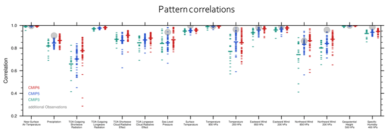 The IPCC AR6 report Chapters 3 and 4, on the present and future climate, use multiple lines of evidence, including results from ESMValTool to evaluate CMIP models (IPCC, 2021), for which the CCI datasets are a key component. Figure 1 shows how one aspect of the CMIP4, CMIP5 and CMIP6 models is compared for a number of metrics and how observation data are used to assess performance.