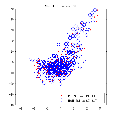 Figure 2: Scatterplot of Niño3.4 timeseries indices for CCI CLT versus CCI SST for 1992-2015 red dots and for CCI CLT versus HadISST for 1982-2014 blue circles.