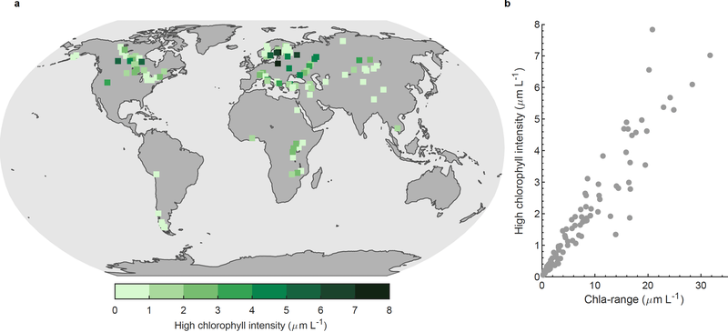 Global intensity of high chlorophyll extreme events. Shown, across the global distribution of studied lakes, are (a) the average intensity of high chlorophyll extreme events, and (b) the relationship between the average intensity of high chlorophyll extreme events and the annual range in chlorophyll concentrations.