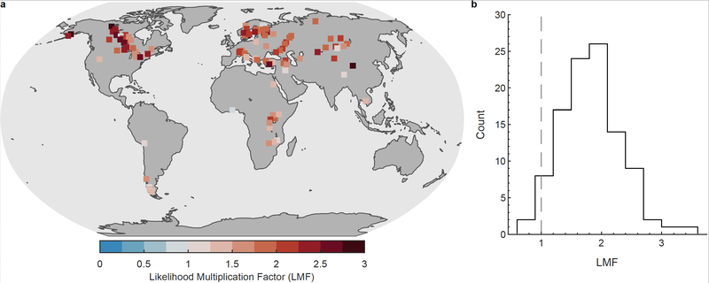 Increase likelihood of compound extremes due to dependence. Shown, across the global distribution of studied lakes, are (a) the calculated likelihood multiplication factor (LMF) for each site, and (b) a histogram summarizing the LMF across lakes. LMF is defined as the ratio of the observed frequency of compound lake heatwave and high chlorophyll extreme events to their expected frequency under the assumption of independence.