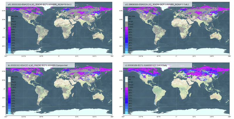 Daily snow cover fraction (SCF) processing workflow example (16 March 2003) for AVHRR10C1.V4 product generation. (a1-a2) Individual sensor maps from NOAA-16 and NOAA-17; grey colors depict cloud cover; (b) Composite SCF map from both sensors; (c) Final AVHRR10C1.V4 SCF product after full processing including cloud gap-filling and quality control.