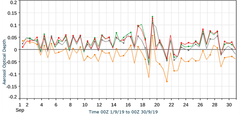 Adding AOD data does not consistently improve the model output (Figure 1). Sometimes using no aerosol data results in the lowest bias in the spin-up period. However, adding SLSTR data to the other AOD data improves the bias in most instances, particularly towards the second half of the month, demonstrating a positive impact of the assimilated observations. The length of the timeseries is short here and more than one season should be considered before reaching firm conclusions.